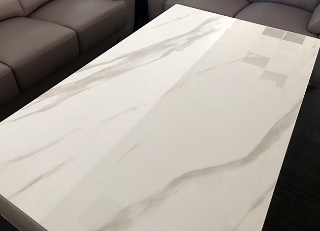 桌面為亮面岩板 烤黑鐵脚